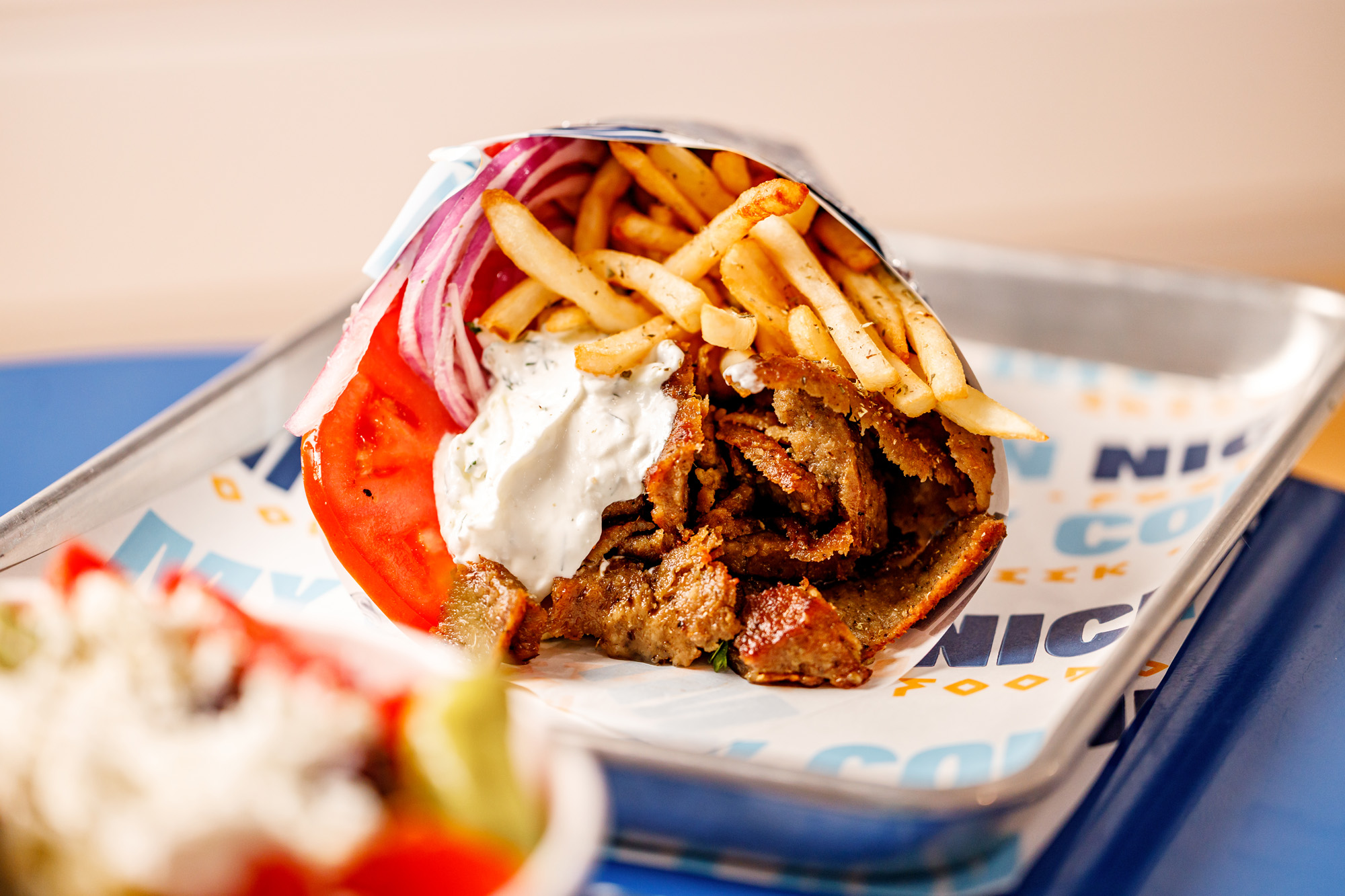 Imagine a warm pita stuffed with perfectly seasoned pork or lamb gyros, crispy fries, and cool tzatziki. Our Hot Honey Halloumi or Yalla Falafel Bowl are both lighter options that are full of flavor and fresh vegetables. You can mix and match as you like on the menu. There are hearty dishes like the Folded Cheeseburger and fresh, simple ones like the Greek Caesar Salad. And when you're ready for dessert, a piece of baklava or a slice of chocolate cake is the best way to end your meal.